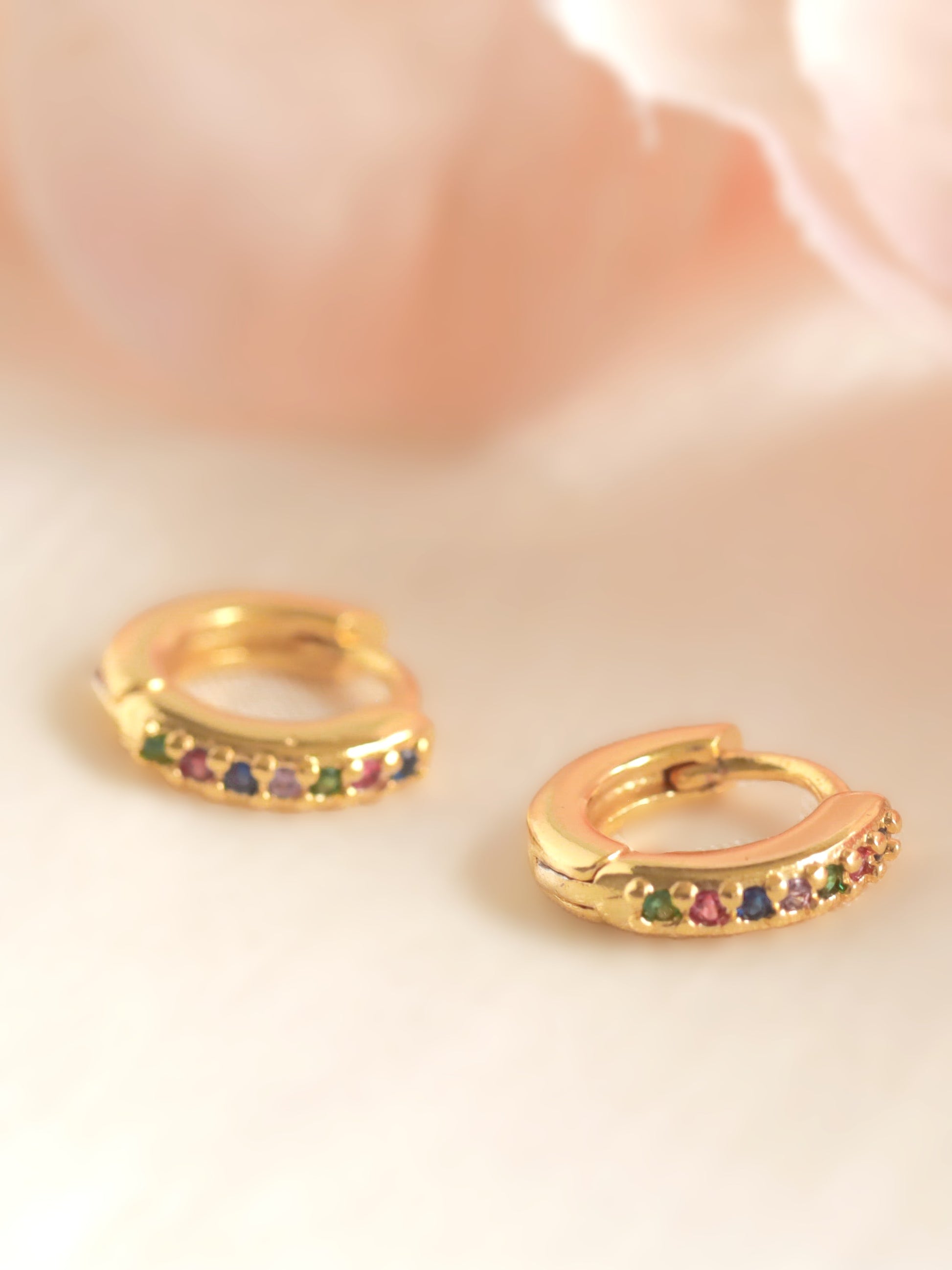 These small rainbow hoops are perfect for everyday wear, featuring a colorful array of stones set in a delicate hoop design. Their vibrant hues add a playful and cheerful touch, making them a charming accessory that brightens up any look.