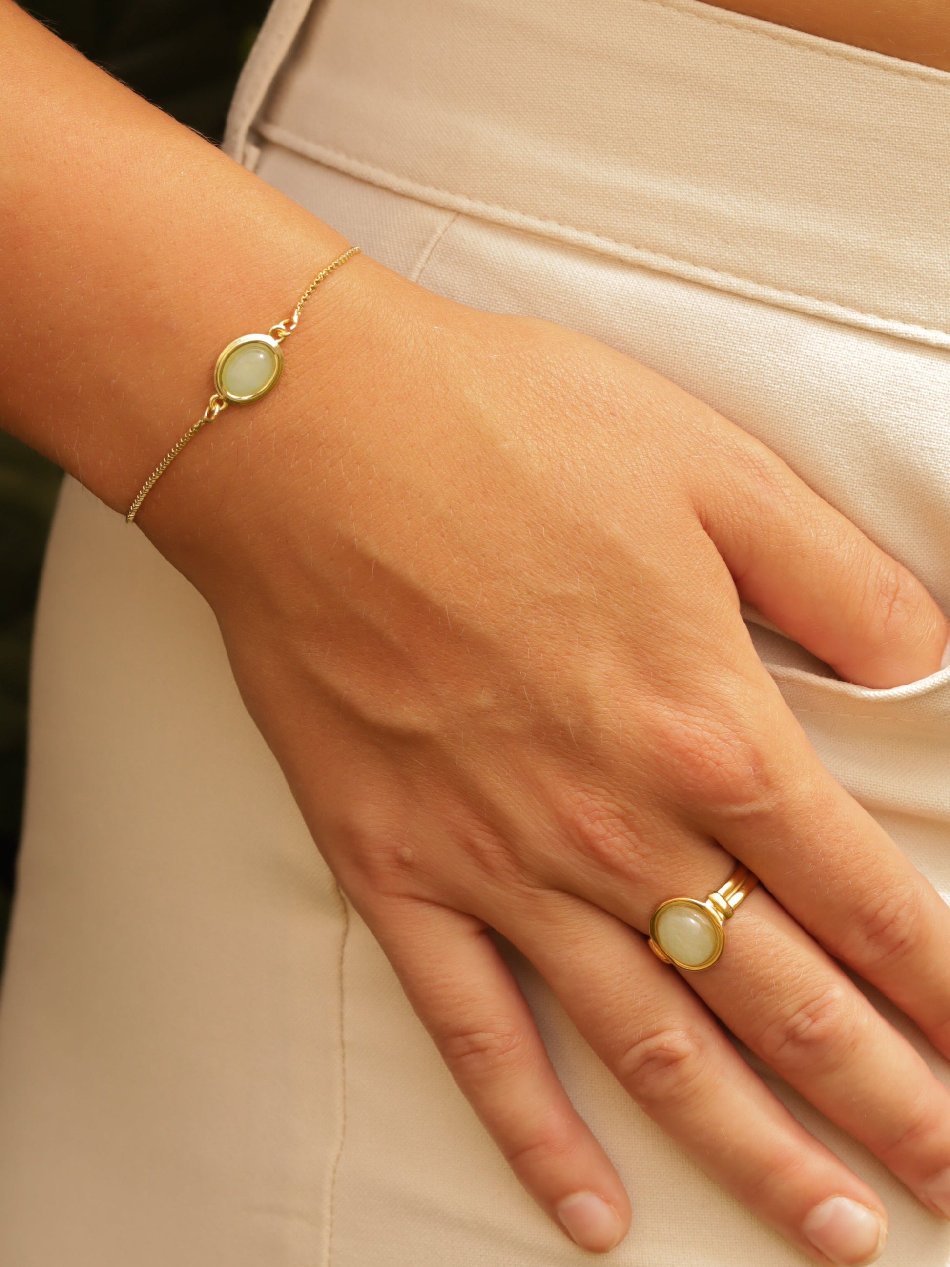 This gorgeous bracelet features a single vibrant peridot stone as the centerpiece. Its striking green hue makes it a bold statement piece, adding a touch of natural beauty and charm to any outfit. Pairs beautifully with our Melanie Ring