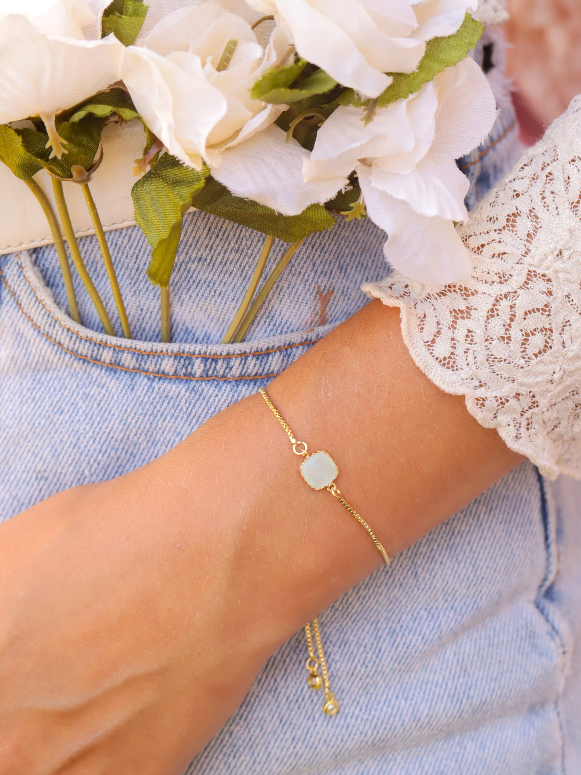 This aquamarine charm bracelet captures the essence of the ocean with its tranquil blue hues. Featuring a jade green charm, it evokes the serene beauty of the sea, adding a touch of coastal elegance to your everyday style.