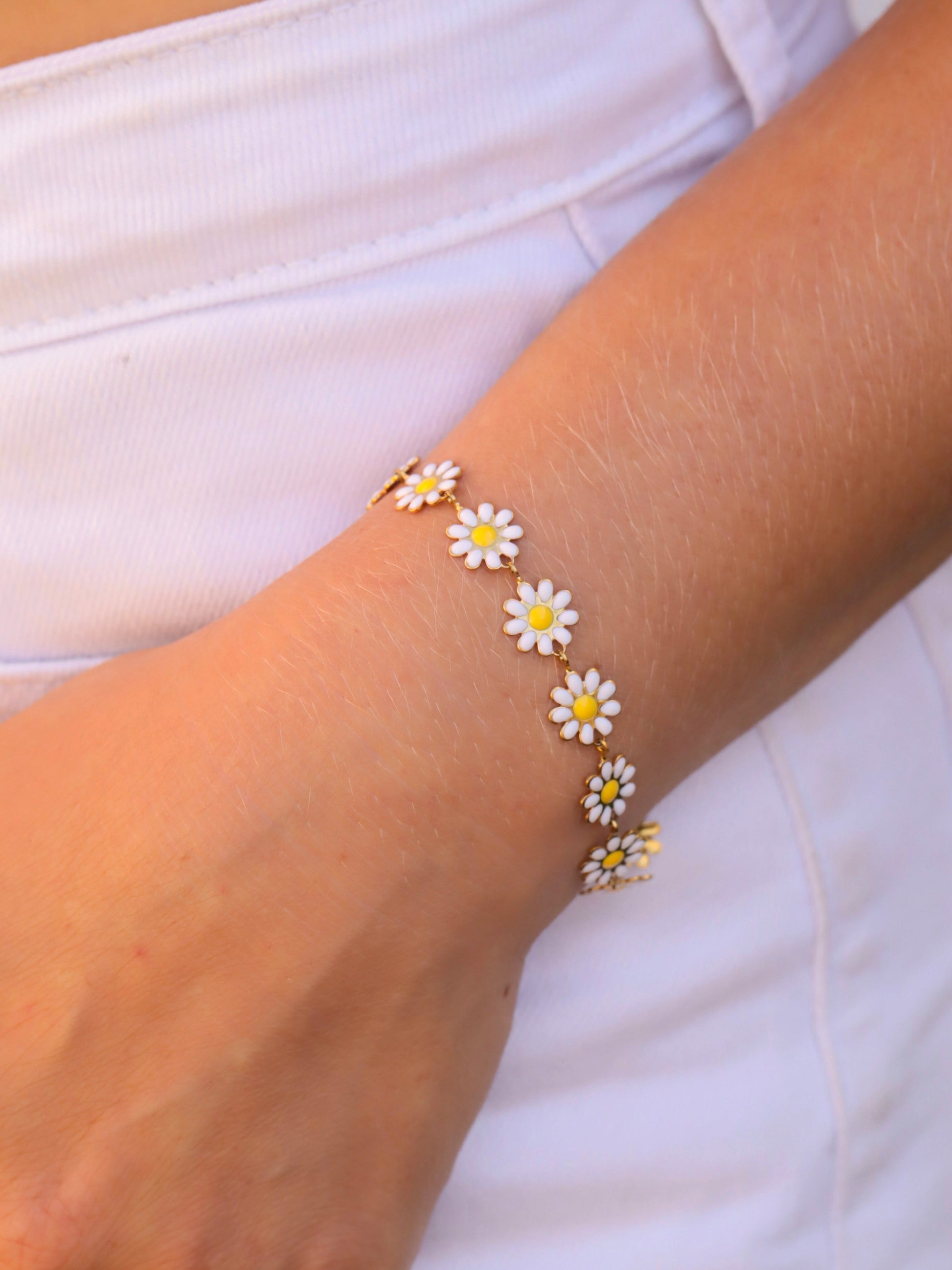 This daisy bracelet features delicate, daisy-shaped charms that bring a touch of nature’s charm to your style. With its simple and playful design, it adds a cheerful, fresh vibe, perfect for brightening up any outfit. A sweet and timeless accessory for everyday wear.