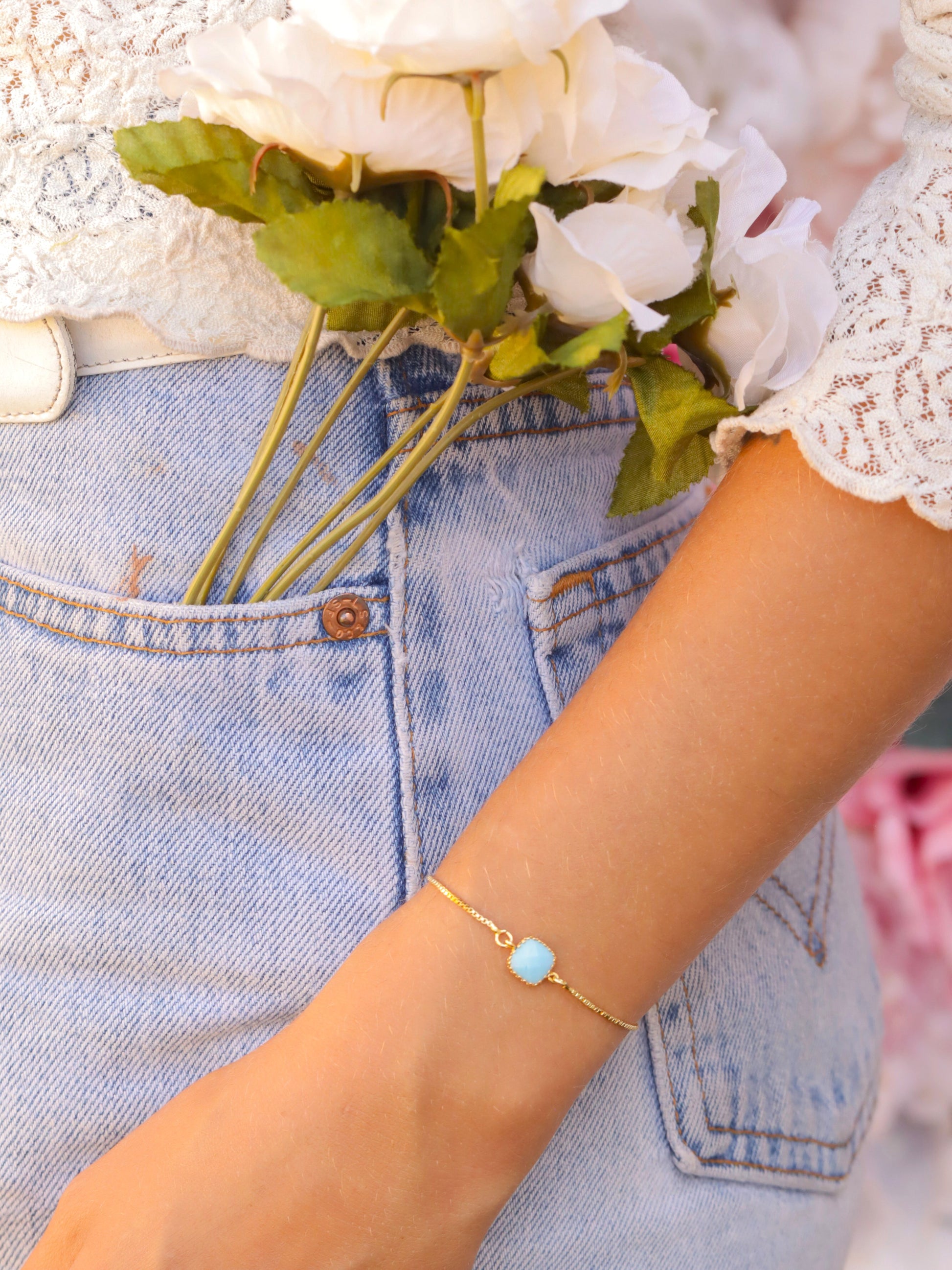 This dainty bracelet features a simple design with a vibrant pop of color. Its understated style is elevated by a bold, colorful accent, adding a fun and eye-catching touch to any outfit.