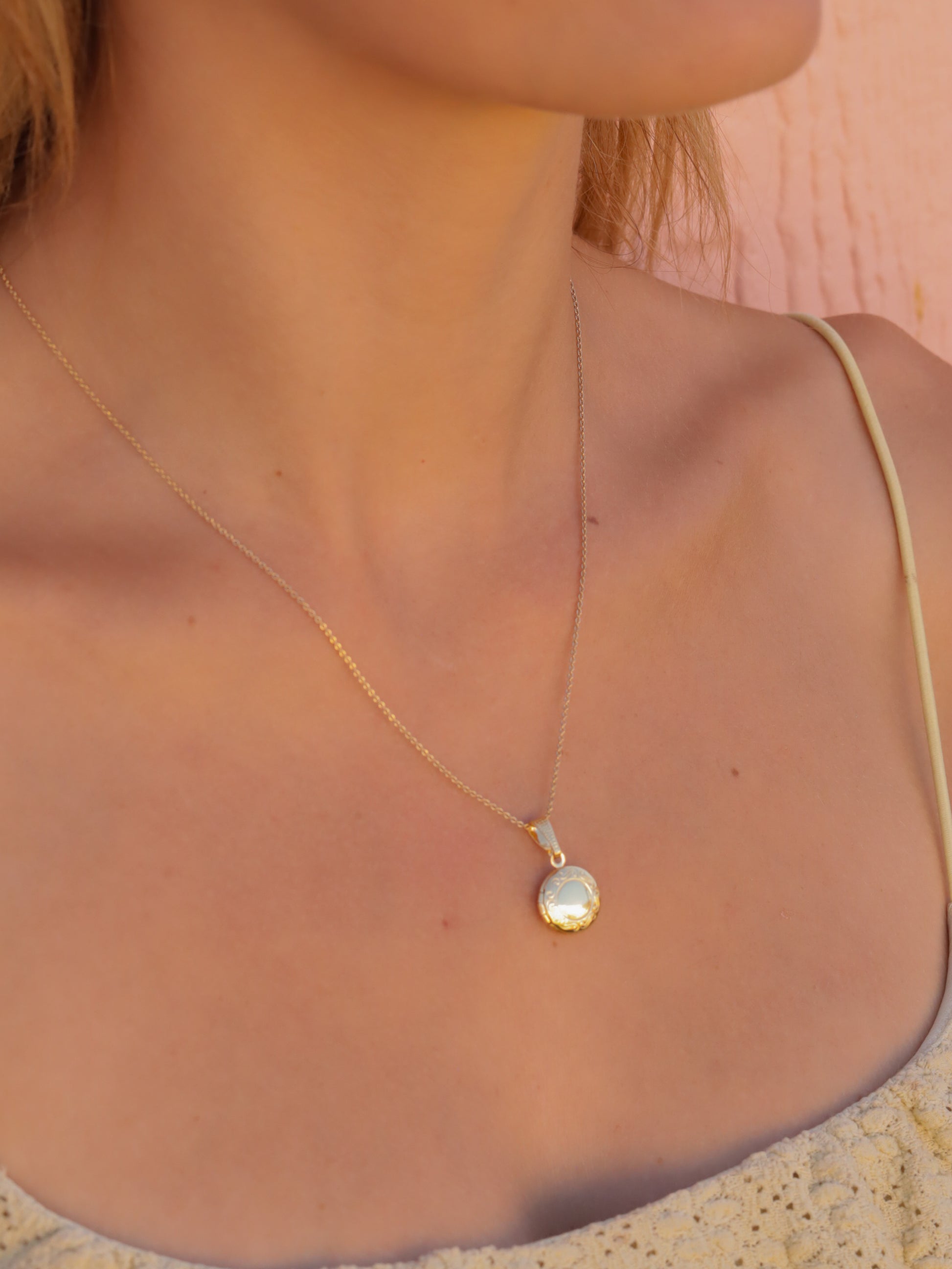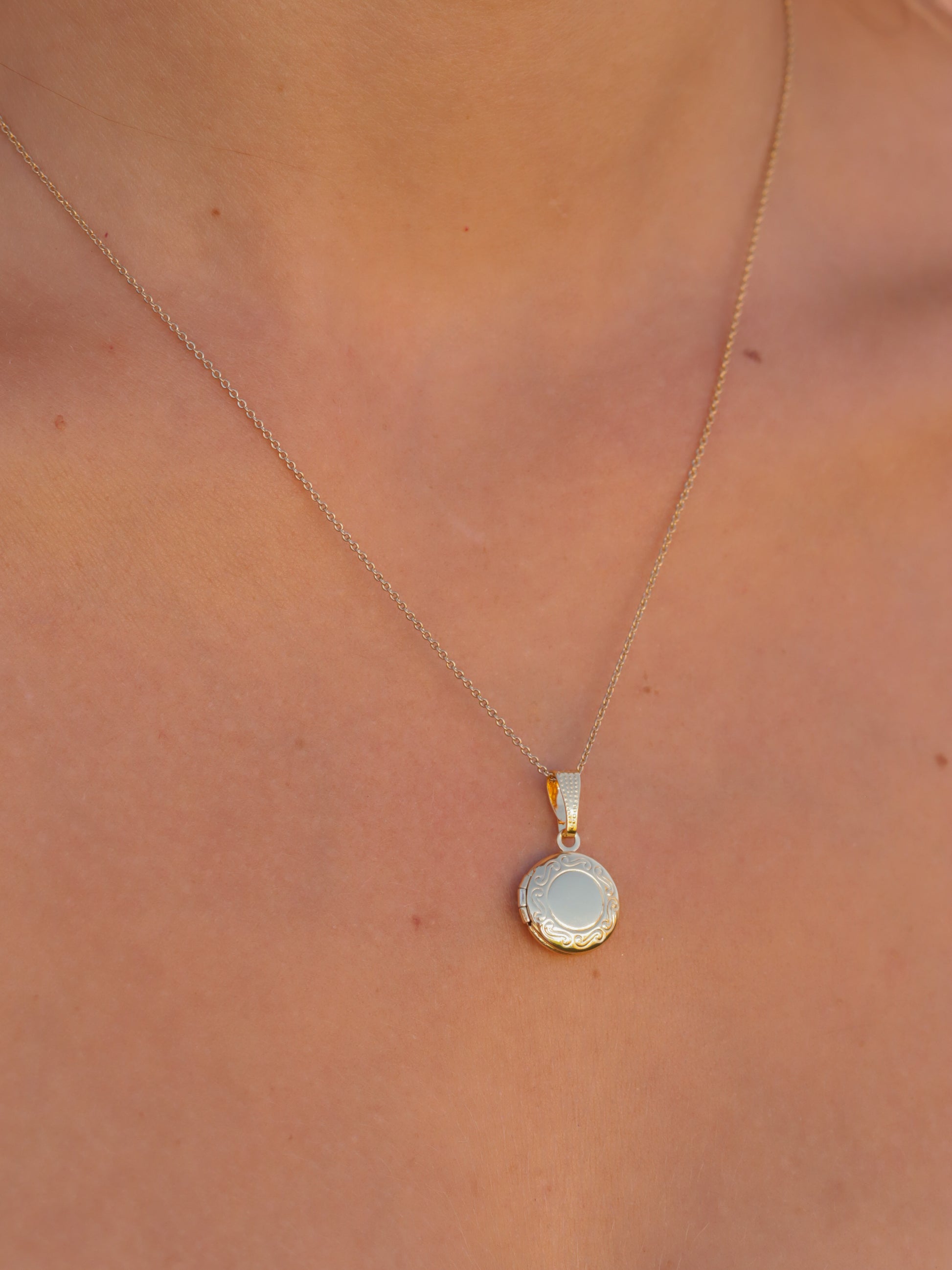 This vintage-inspired circle locket necklace features a beautifully crafted locket with intricate detailing. The classic circle design opens to reveal space for cherished photos or mementos, adding a touch of nostalgia and personal significance to your look.