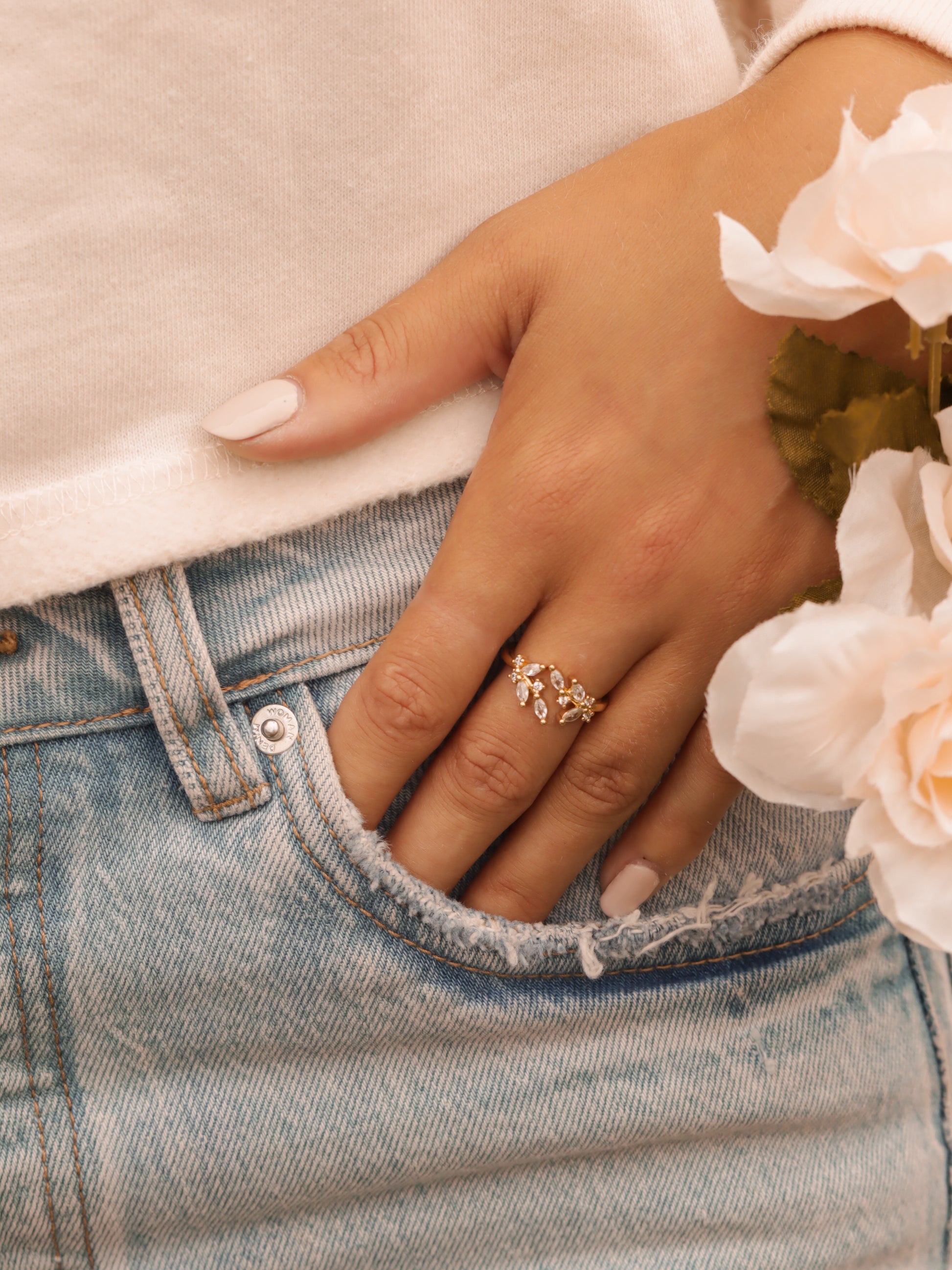 This elegant gold ring, featuring a sparkly cubic zirconia leaf design, is adjustable and fits any finger size with ease. The dazzling cubic zirconia adds a brilliant shine, perfect for adding a touch of sparkle and sophistication to any hand.