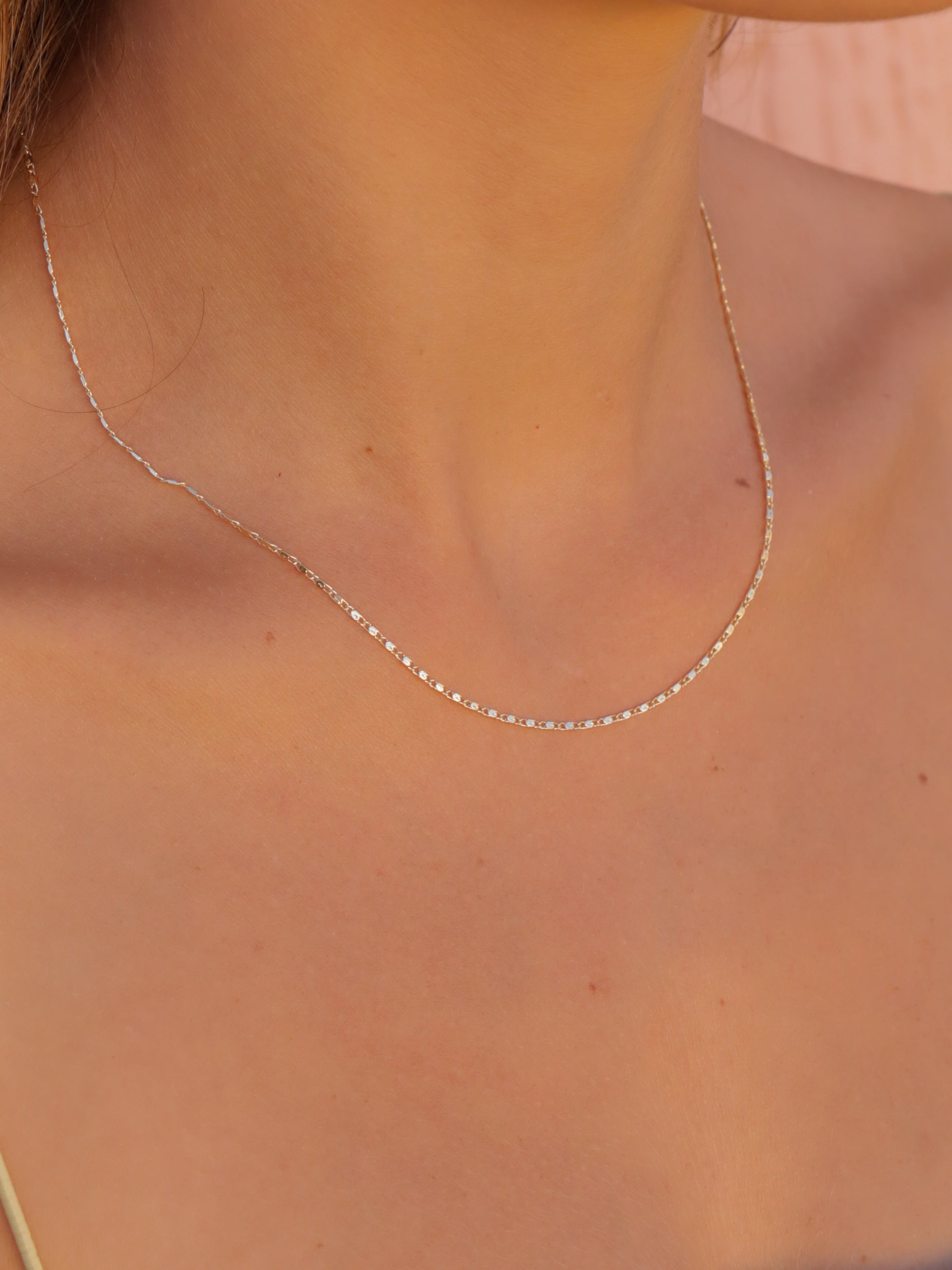 This shiny gold chain features a sleek and simple design, making it perfect for layering with other pieces or wearing alone for a minimalist look. Its subtle sheen adds a touch of brightness to any outfit, making it a versatile and timeless accessory.