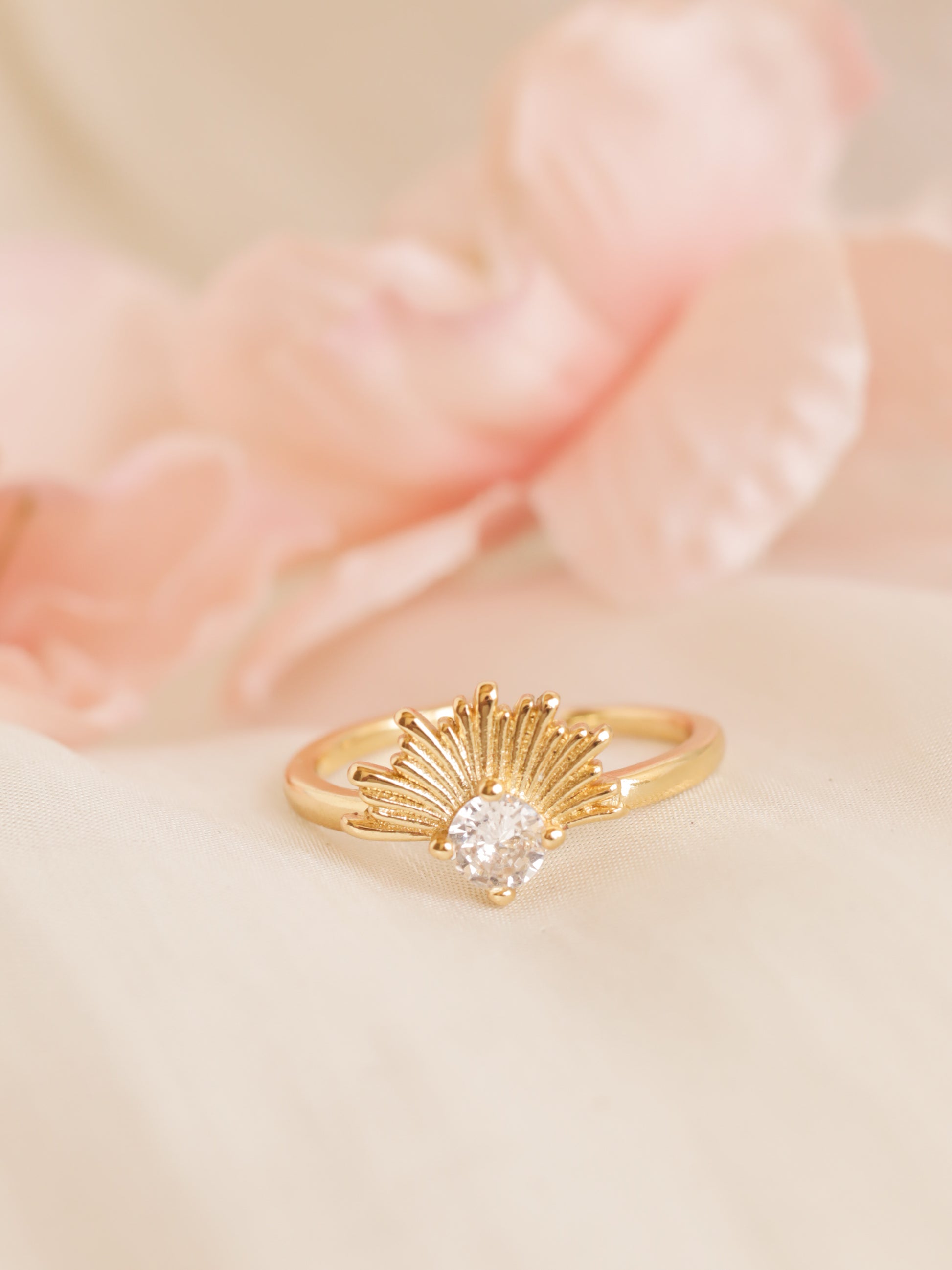 This sunrise ring features a stunning cubic zirconia stone that captures the brilliance of morning light. Its radiant sparkle is enhanced by the sunrise-inspired design, making it a dazzling yet elegant piece perfect for any occasion.