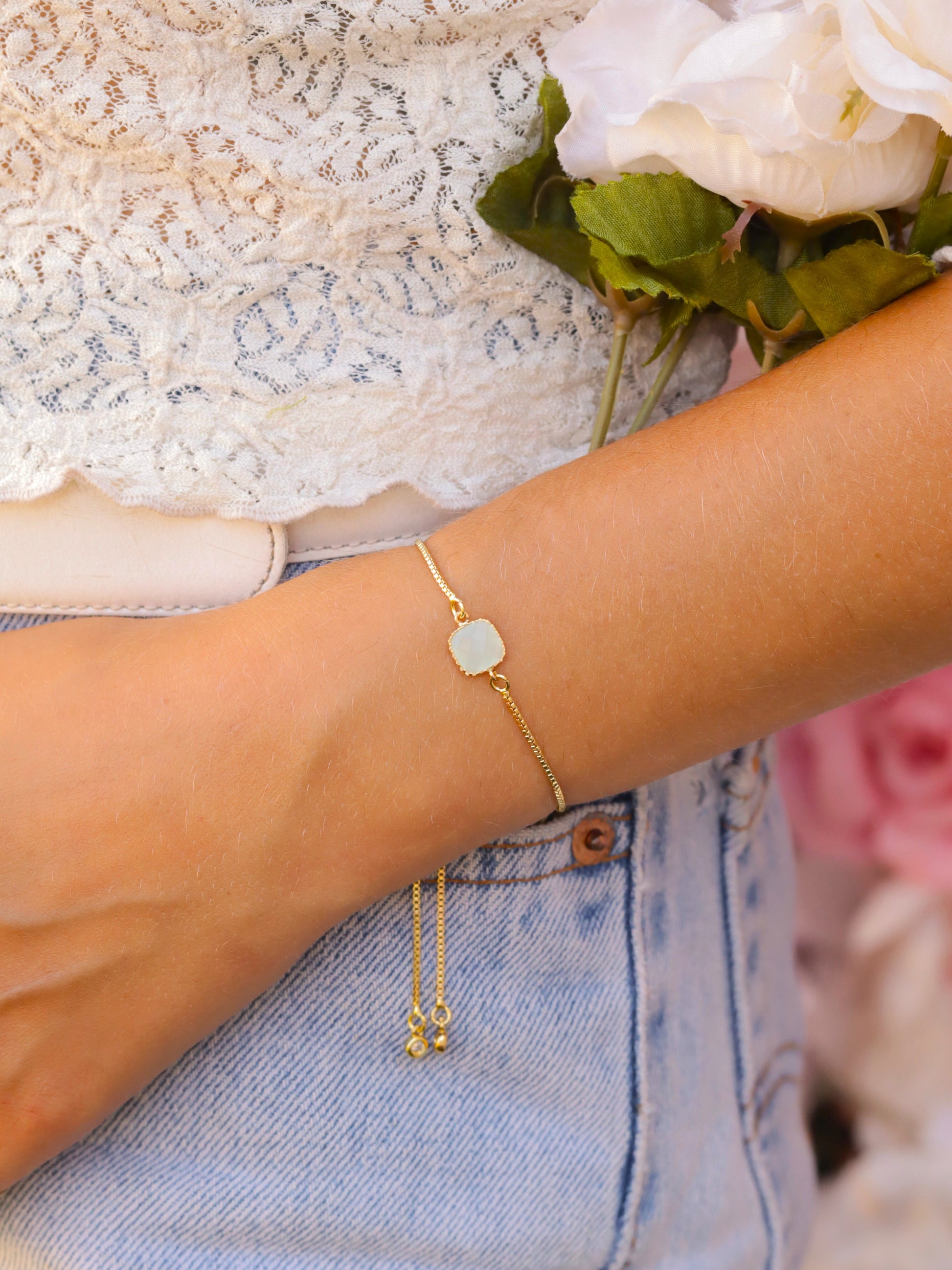 This dainty bracelet features a simple design with a vibrant pop of color. Its understated style is elevated by a bold, colorful accent, adding a fun and eye-catching touch to any outfit.