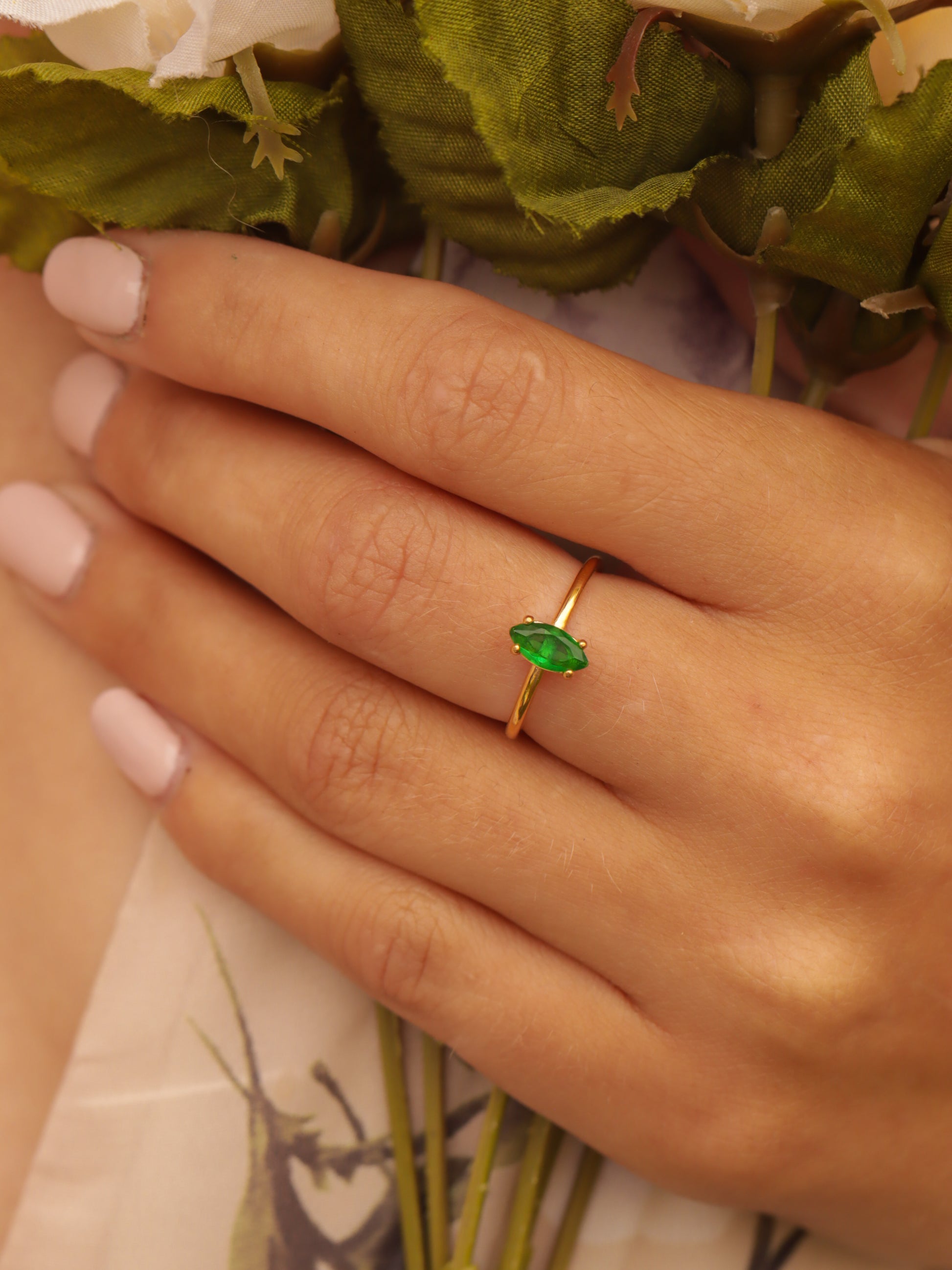 This ring features a stunning marquise-cut emerald stone, its vibrant green hue standing out in a sleek, minimalist setting. The unique marquise shape adds a distinctive touch, making it a striking yet versatile accessory for any occasion.